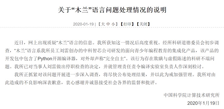 近日,网上出现质疑“木兰”语言的信息。我所获知这一情况后高度重视。经所科研道德委员会初步调查,“木兰”语言系我所员工刘雷创办的中科智芯公司研发的面向青少年编程教育的集成化产品,该产品的开发包中包含了Python开源编译器,对外却声称“完全自主”。该行为存在欺瞒与虚假陈述的科研不端问题。我所已对当事人刘雷做出停职检查的决定,并就管理责任责令编译实验室负责人作深刻检讨。
