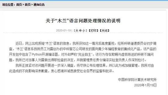 1月19日,中科院计算所在官网通知公告一栏刊登《关于“木兰”语言问题处理情况的说明》表示:“木兰”语言系我所员工刘雷创办的中科智芯公司研发的面向青少年编程教育的集成化产品。当事人刘雷号称“完全自主研发”行为存在欺瞒与虚假陈述的科研不端问题,已停职检查。
