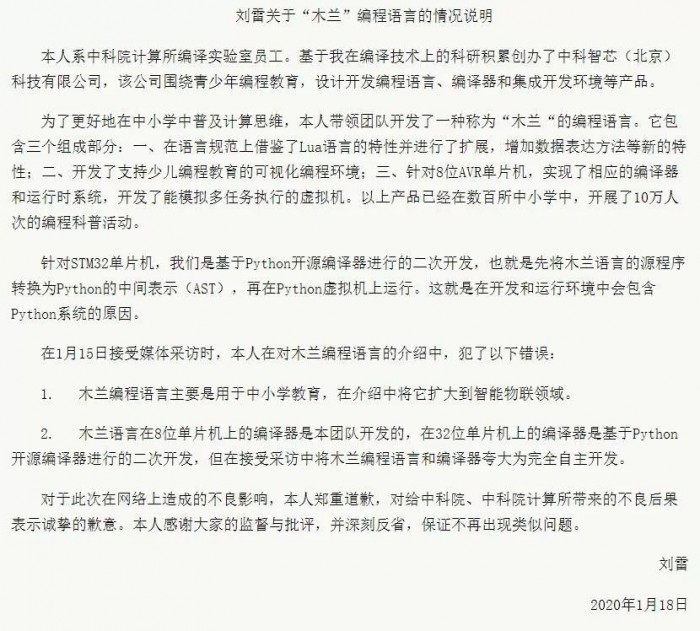 1月17日,“木兰”语言研发团队负责人、中科院计算所编译实验室员工刘雷在科学网发表回应称,“木兰”语言在8位单片机上的编译器是本团队开发的,但在32位单片机上的编译器是基于Python开源编译器进行的二次开发。