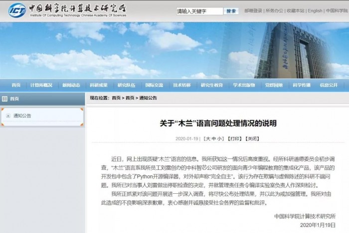 今天,中科院计算所出面回应了此事,提到“木兰”语言系所内员工刘雷创办的中科智芯公司研发的面向青少年编程教育的集成化产品,该产品的开发包中包含了Python开源编译器,对外声称“完全自主”的行为存在欺瞒与虚假陈述的科研不端问题。