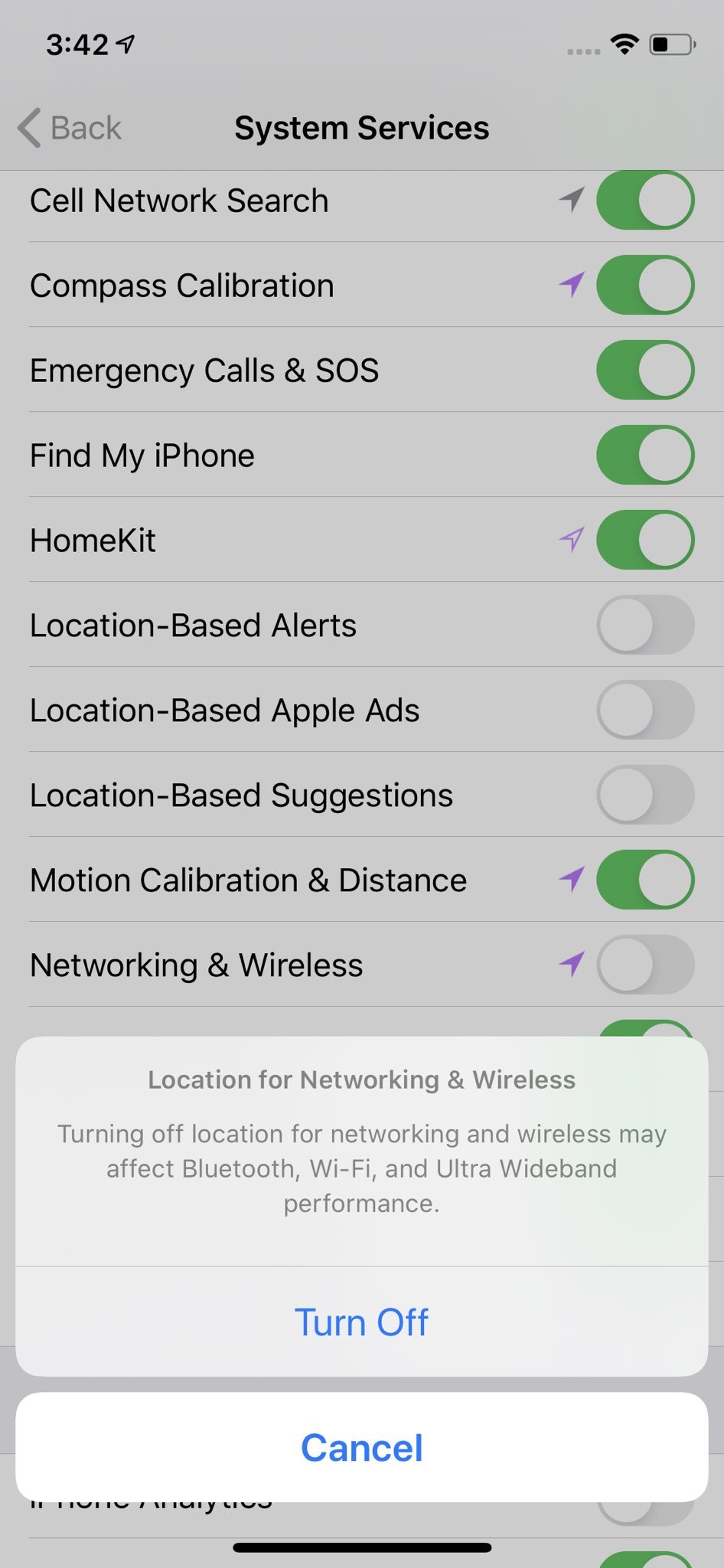 即使关闭了所有应用的位置请求,新款iPhone状态栏上仍然会出现定位图标,人们原以为这只是个系统漏洞,直至去年12月安全记者布莱恩·克雷布斯(Brian Krebs)对此进行了调查。根据苹果公司的说法,超宽频芯片并不是在任何的国家地区都可以使用,因此iPhone 11会通过使用定位服务来确定该芯片是否可以启用。
