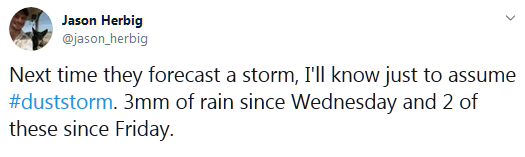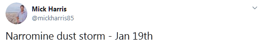 1月19日,沙尘抵达了新南威尔士州、袭击了悉尼西北250英里(400公里)处的区域中心。之后,沙尘暴的图片和视频在社交媒体上广泛传播。