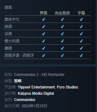 《盟军敢死队2:高清重置版》目前已经确认追加官方简体中文支持,该游戏将于2020年1月25日登陆Steam平台,之后将登陆PS4,XboxOne和Switch平台,敬请期待。