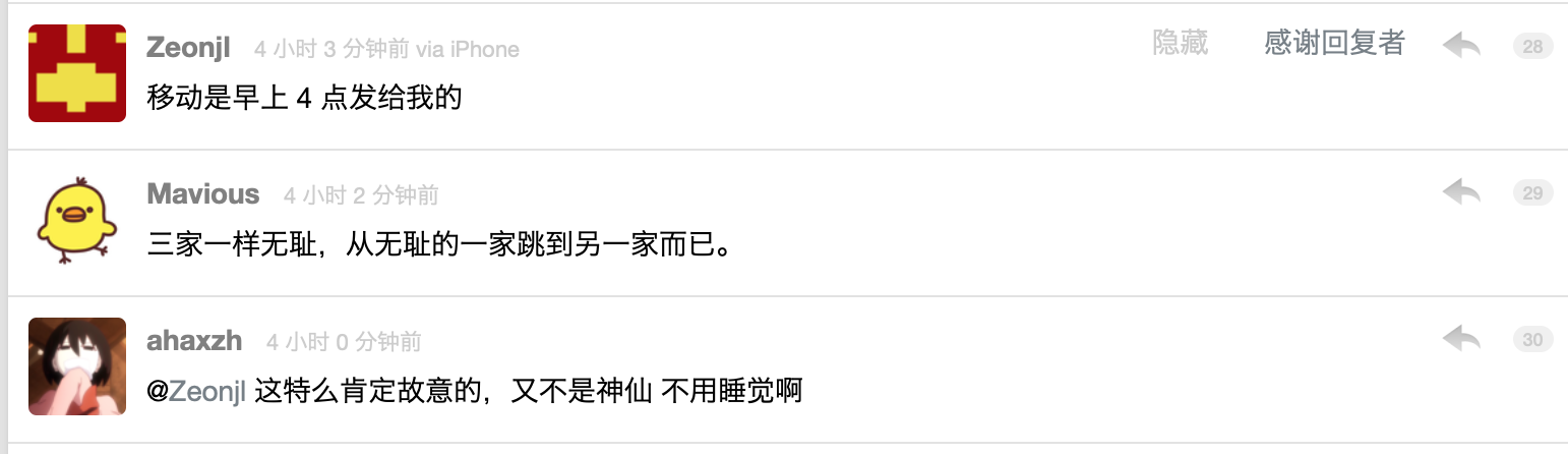所以我就打电话到了12315。根据帖子的反馈来看,中国移动、中国电信,都有类似的恶意的、