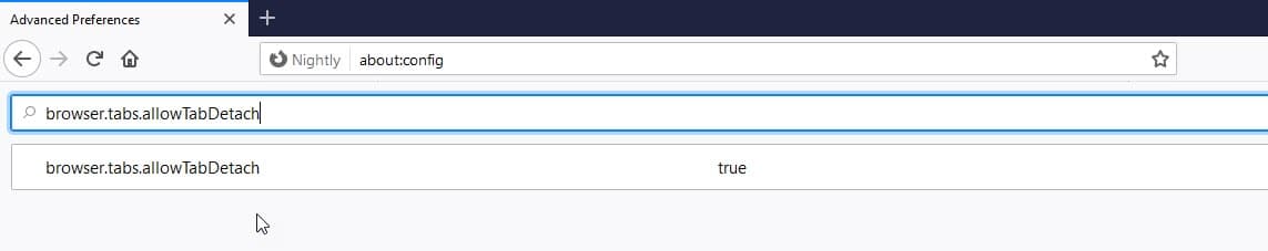 2.在搜索框中,键入“detach”(不带引号),然后将browser.tabs.allowTabDetach首选值切换为false。