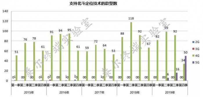 2019年第四季度申请进网的手机中支持定位功能的104款,全为4G、5G手机。4G手机支持北斗定位有34款,申请进网的50款5G手机全部支持。