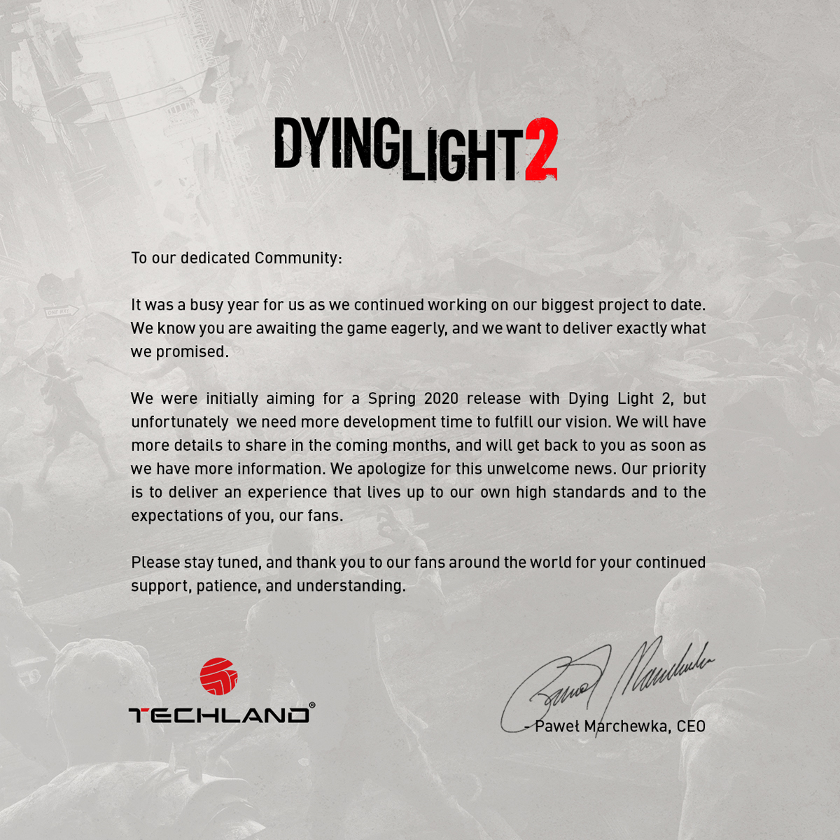 Techland公司CEO专门针对《消逝的光芒2》延期一事向玩家道歉,表示为了达到更好的质量,开发团队需要更多时间对游戏进行打磨。未来几个月将陆续发布游戏的更多消息。