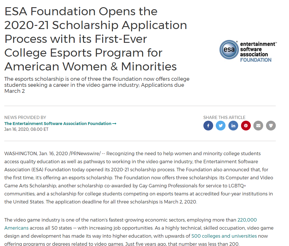 该奖学金与基金会现有的计算机和视频游戏艺术奖学金一起设立,后者于2007年设立,旨在帮助大学生从事与视频游戏相关的学位职业。据ESA称,由于有合作关系,符合资格的学生可以同时申请“ Gay Gaming Professionals”奖学金。这两项奖学金均针对2020年至2021年学年提供。这项新计划进一步强调了电子竞技是一个合法且不断发展的领域。