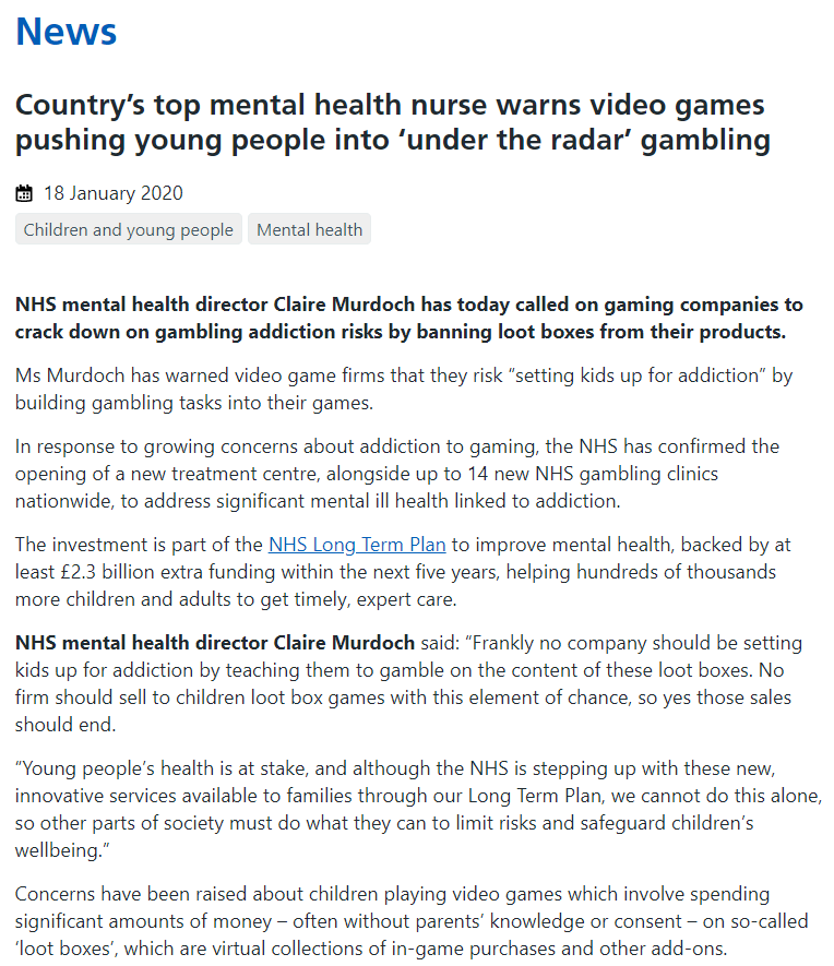 据外媒报道,英国国家卫生局(NHS)精神卫生主管Claire Murdoch近日在一份声明中警告称,电子游戏中的战利品箱可能“使孩子上瘾”。Murdoch还在声明中呼吁视频游戏公司禁止对儿童销售战利品箱,这与世界上其他一些国家的政府相呼应,其中一些政府对视频游戏中的战利品箱越来越持怀疑态度 。