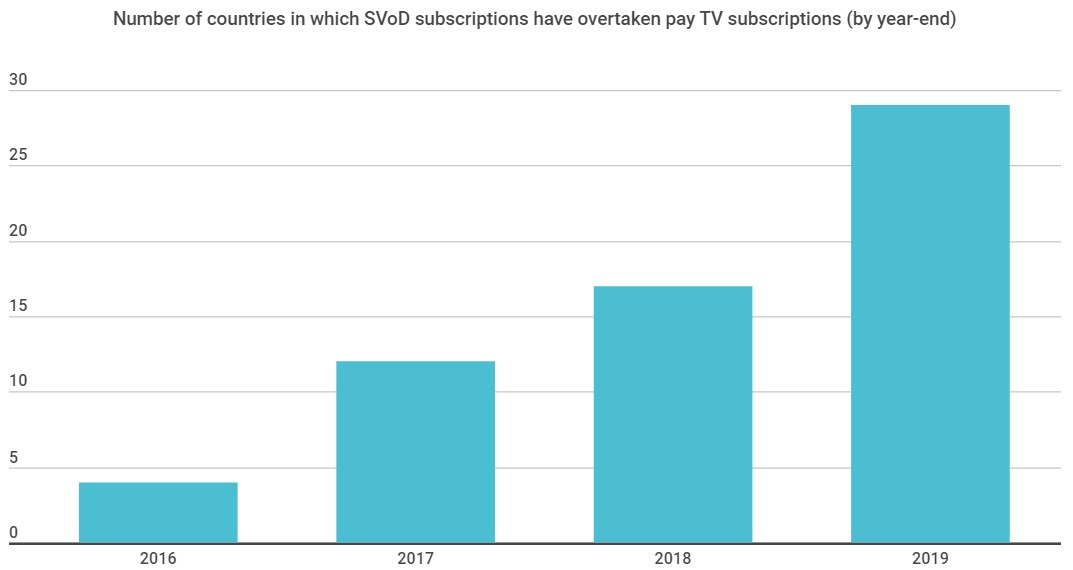 与2018年相比,2019年又有12个国家/地区的SVOD视频订阅量超过付费电视订阅量-该年的最终总数为29个国家。到今年年底,将有超过30个国家实现这一里程碑,这标志着娱乐市场的重要转折点。