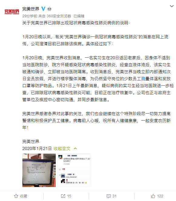 1月20日晚,完美世界收到消息,一名实习生在20日返回老家后,因身体不适到当地医院就诊,院方怀疑感染冠状病毒感染性肺炎,经查血液体液后,该实习生被通知确诊,立即被当地医院隔离。收到消息后,完美世界当晚立即内部通知次日全员放假,并进行楼宇整体消毒,为仍然坚守岗位的少数员工测量体温和发放口罩等防护物品。1月21日上午最新消息,疑似病例的实习生经当地医院进一步检查,已排除冠状病毒感染性肺炎可能,目前正在治疗恢复中。公司也正与政府主管单位及疾控中心密切沟通,并同步最新信息。