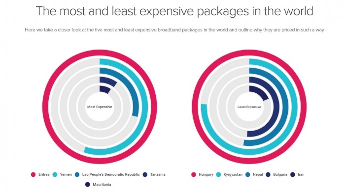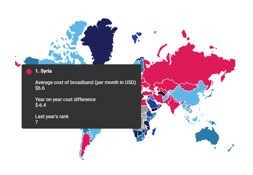 如果你想要世界上最便宜的宽带,那就看看叙利亚,那里的平均价格是每月6.60美元,最低的是2.52美元。值得注意的是,这主要是由于叙利亚镑持续贬值和战争造成的。另外,平均速度只有0.9Mbps。其余最便宜的国家包括乌克兰(6.64美元)、俄罗斯(7.35美元)、罗马尼亚(8.15美元)和白俄罗斯(9.87美元)。最昂贵的地区是非洲国家厄立特里亚,那里的平均价格是每月2666美元,最昂贵的套餐费用达到15051美元。