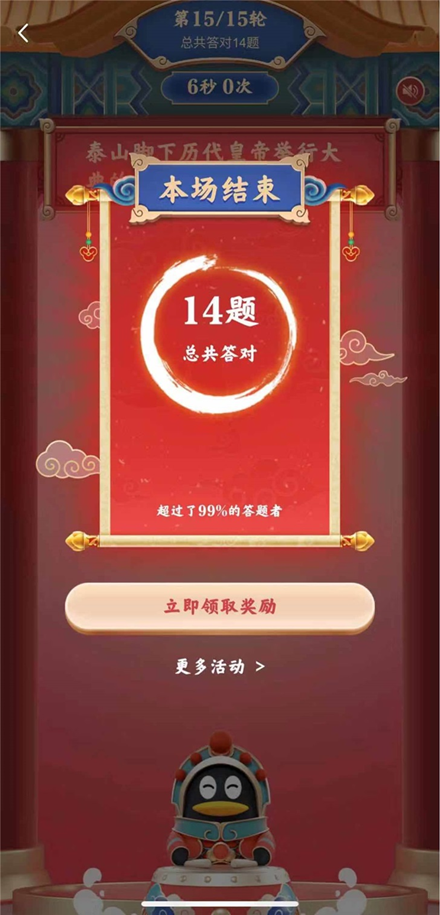 答题抢荷包。点击手机QQ消息窗口的右上角吊坠,或者下拉小程序入口,从顶部广告图进入活动答题。题目以成语、对联等形式出现,答题结束后,只要不是0分,就可以点击“立即领取奖励”开奖,奖品包括现金红包、游戏皮肤、优惠券等。
