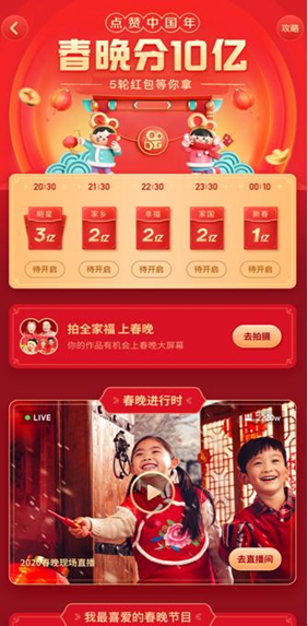 1. 今年快手成为春晚独家互动合作伙伴,除夕当晚将发出10亿现金红包,共计5轮,采用“视频+点赞”的玩法。