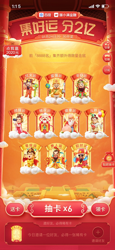 1. 今年百度旗下多款App都可以参与抢红包,包括百度App、百度极速版App、好看视频、全民小视频、百度贴吧、百度网盘、百度地图、爱奇艺等。集齐10种好运卡,瓜分2亿现金红包,包含团圆运、健康运等7种普通卡,享瘦运、招财运等3种稀有卡。
