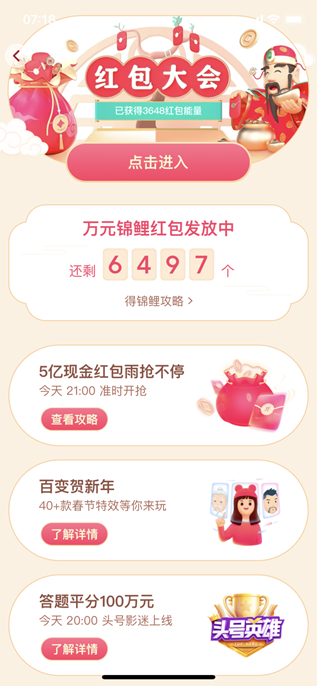 3. 红包大会。参与“财神吃元宝”、“偷吃年夜饭”、“吉祥话拜年”、“舞狮吃彩球”、“亲戚走起来”等十多款春节主题的互动小游戏,可以抽取现金红包,瓜分5亿。