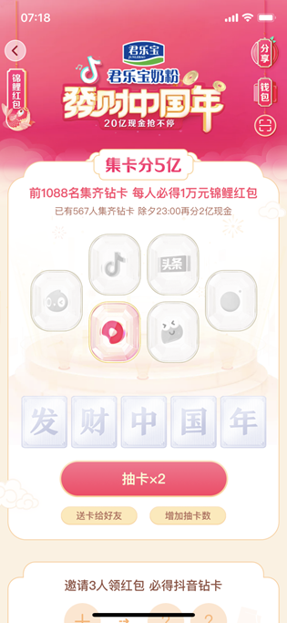 1. 集金卡。集齐“发财中国年”五字可参与平分3亿红包,集卡可以通过每日2次抽卡机会,以及邀请好友、分享重复卡、观看小视频/直播等获得。