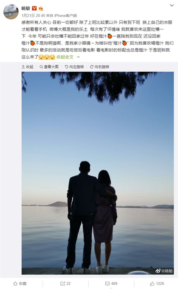1月21日晚,@暁勄 在微博上感谢了网友的关心,并表示目前一切都好。配图是和男友的合影,两人站在水边,并肩看向远方。
