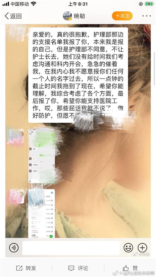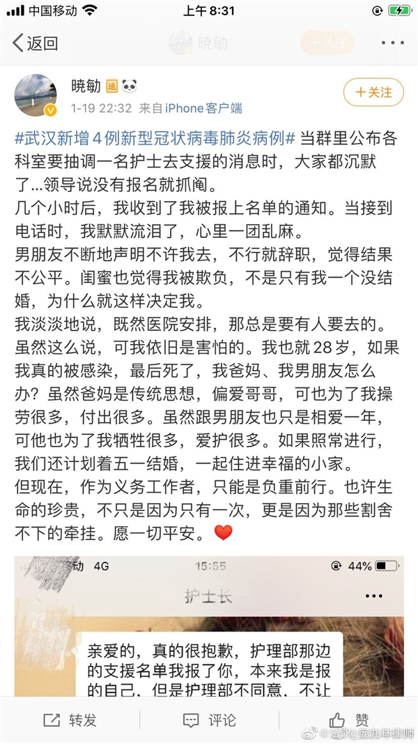 近日,一名武汉女护士的决定感动了众多微博网友,获赞“最可爱的人”。1月19晚,网友@暁勄 发微博分享了自己被医院抽调去支援的切身经历和内心世界。她在微博中写道:“作为义务工作者,只能是负重前行。也许生命的珍贵,不只是因为只有一次,更是因为那些割舍不下的牵挂。”