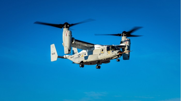 近日CMV-22B鱼鹰(Osprey)在美国德州的阿马里洛装配中心完成了首次飞行。该倾转旋翼机由美国波音公司和贝尔直升机德事隆(Bell