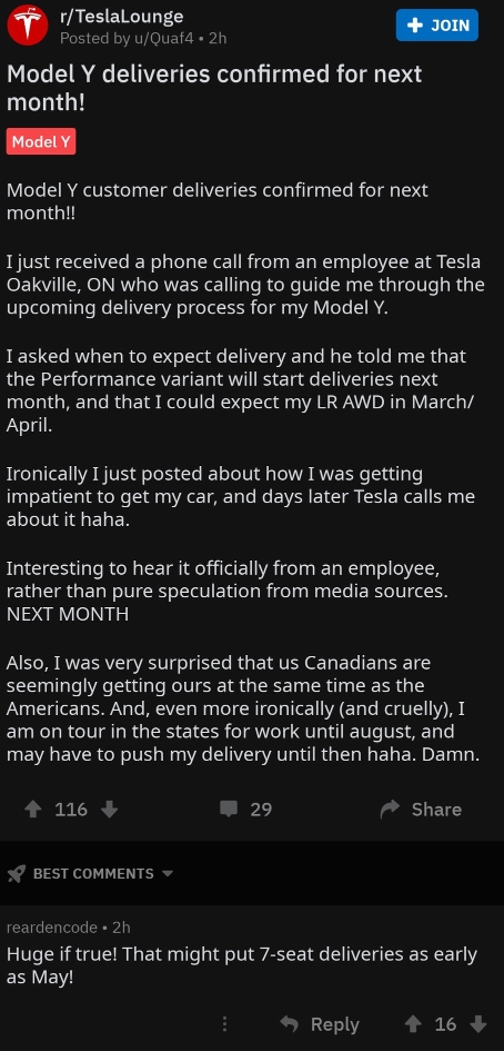 近日,有一位来自加拿大的Mode Y预定车主称,他接到来自特斯拉员工的电话,告诉他Mode Y将于下月在开启交付,并透露了大致的交付时间。这位加拿大车主透露的信息显示,双电机全轮驱动Performance高性能版将率先于2月开启交付;双电机全轮驱动长续航版则会在3/4月左右开启交付;7座版车型有望在5月开启交付;第三季度所有配置车型均可交付。