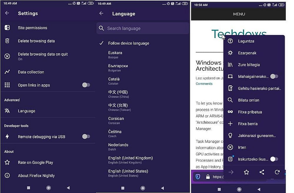 在新版本中,Mozilla允许用户通过设置页面的语言选项来更改Firefox Preview浏览器的UI语言。该浏览器默认跟随Android设备语言的设置,不过现在允许用户更改应用的UI语言。不过需要注意的是,仅限于Fenix应用语言的更改,网站内容并不会进行改变。