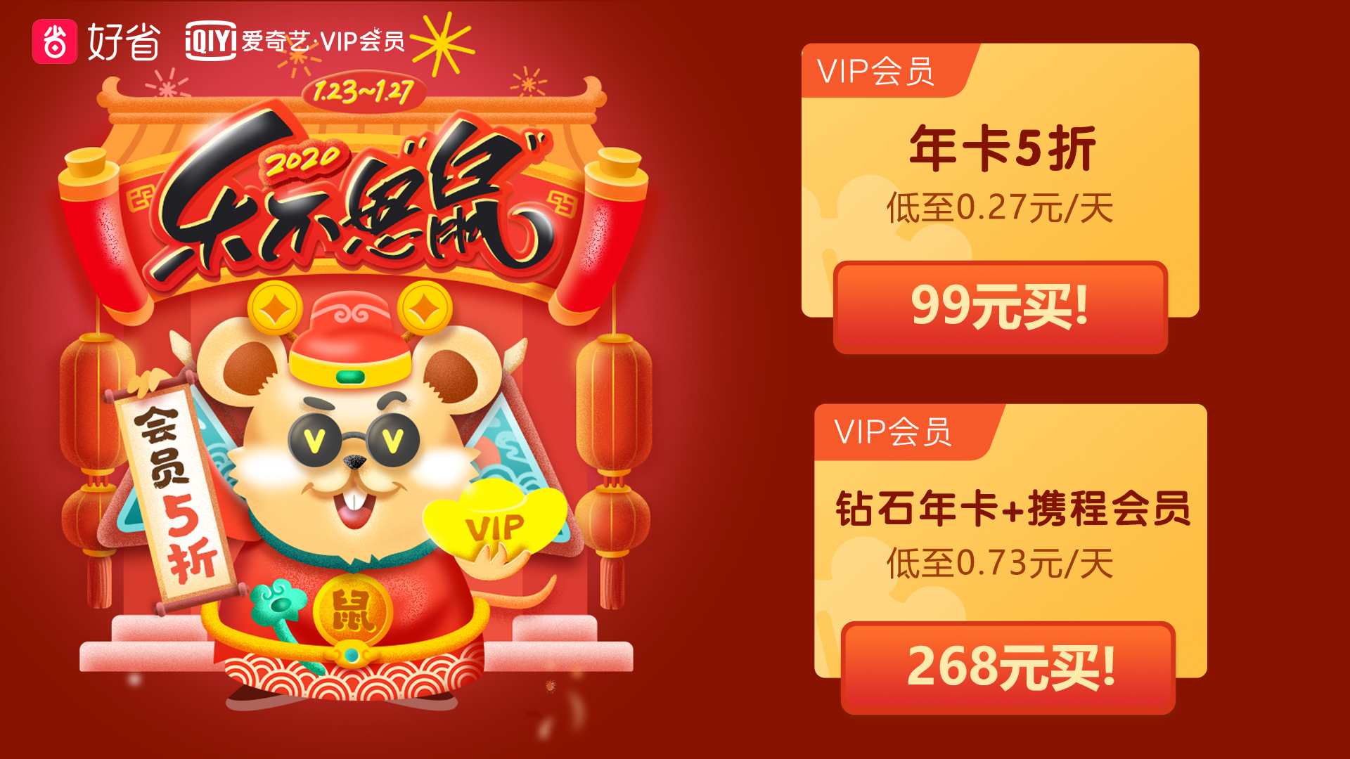 22日晚20:00至27日大年初三,爱奇艺新春五折大促上线,年卡99元,一次购买可以同时用在手机、电脑和Pad三屏之上,钻石年卡+携程会员268元,还可在扩展到智能电视上收看,如果是新用户则第一个月只需要支付8元就可以买到。