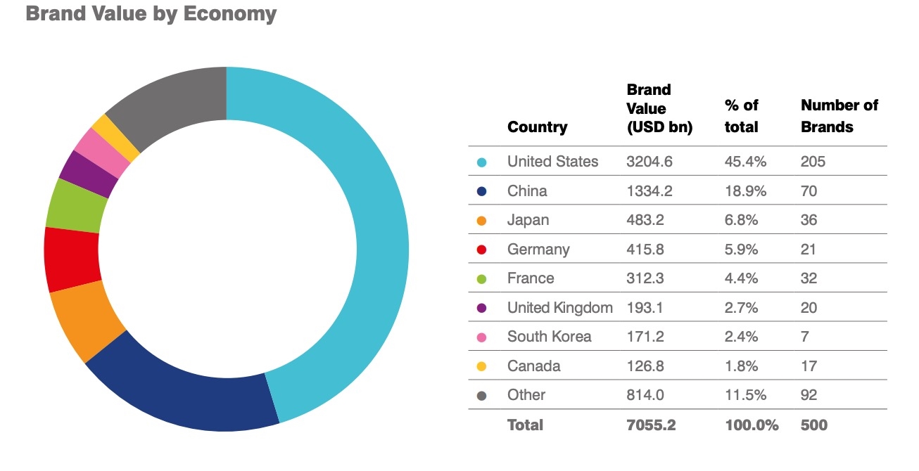 中国在前500强中共有70家公司,份额为18.9%,品牌价值为1334亿美元。