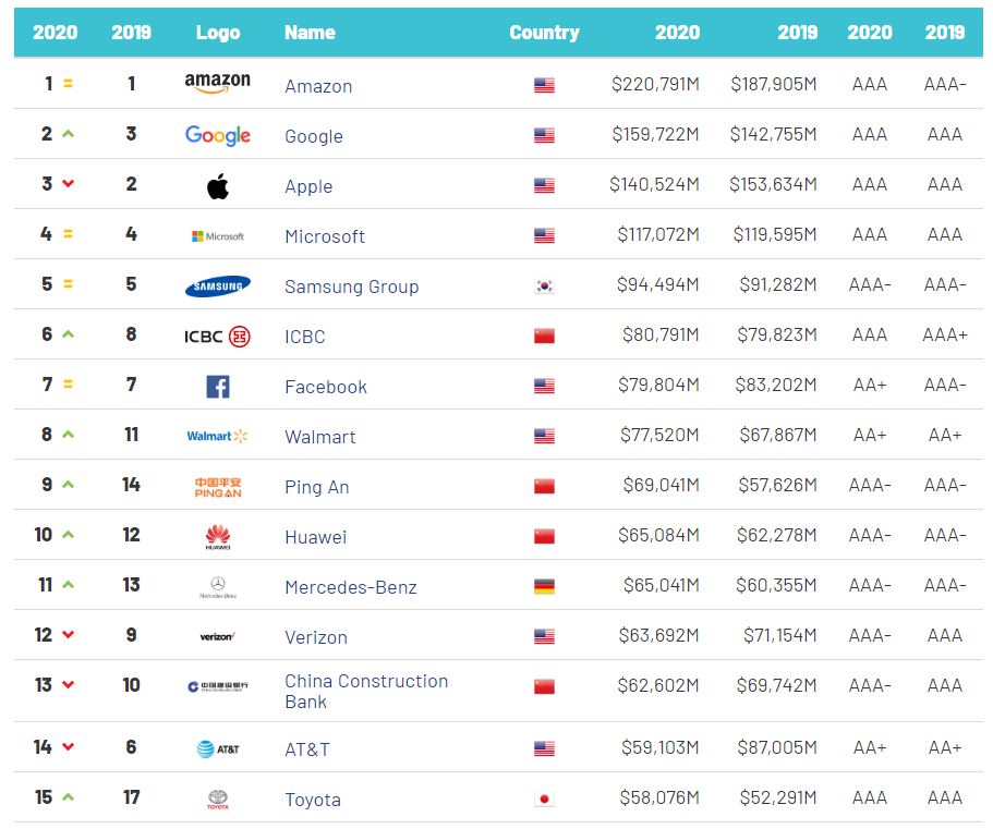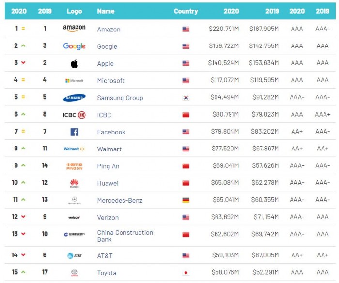 据外媒报道,BrandFinance (英国品牌金融咨询公司) 发布《2020年全球最具价值品牌500排行榜》(Brand Finance Global 500 2020)。在排行榜前10名中,美国公司共占6席,中国公司占3席,韩国公司占1席。