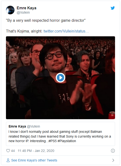 据长期关注DC、蝙蝠侠并于索尼有某种关系的Emre Kaya在其个人推特上透露,索尼正在为PS平台打造一款全新的恐怖游戏,而且该消息还被打上了PS5的标签,也许这款恐怖游戏新作将会为PS5服务。在后续的推特中,该消息人士还透露,这款恐怖游戏新作由备受尊敬的导演负责,并且放上了小岛秀夫的图片。这被国外玩家认为是小岛秀夫正在为PS5开发恐怖游戏。然而Emre Kaya又在稍后的推特中否认自己掌握游戏导演的情报。