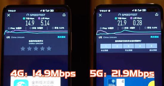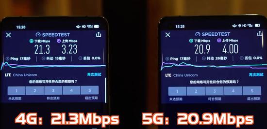 第三轮测试,完全相同的两部5G手机,左侧4G网络下测速为21.3Mbps,右侧5G网络下测速为20.9Mbps,从网速来看,4G和5G速度已近乎相同。
