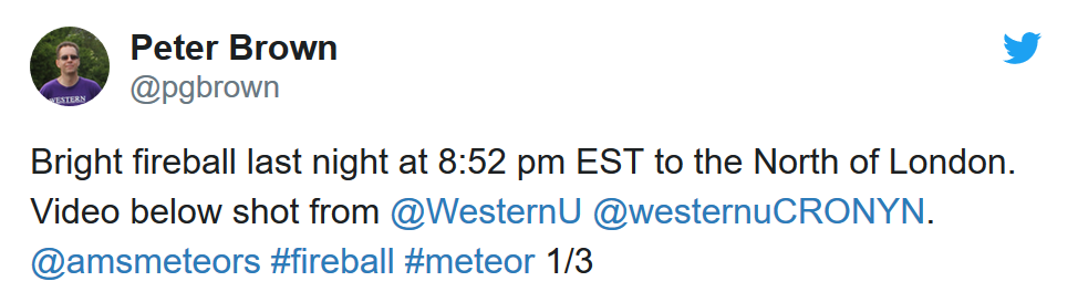 加拿大西安大略大学流星科学家和行星天文学家Peter Brown于当地时间周二晚披露了关于这颗火球的一些细节信息。