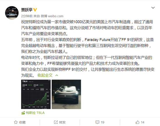 对此,电动汽车品牌Faraday Future的创始人贾跃亭在微博上发文表达了对特斯拉的祝贺。贾跃亭表示特斯拉达到如此高得市值,这充分说明了市场对电动车的旺盛需求,以及百年汽车产业将要迎来变革拐点。电动车时代,特斯拉证明了自己的领军地位;但在下一代互联网智能汽车产业的变革和角力中,FF希望能够凭借强大的产品力和技术力成为变革的主角。