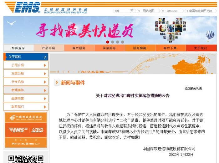 为了保护广大人民群众的用邮安全,对于经武汉发出的邮件,我们将在武汉及寄达地处理中心对邮件与车辆分别进行“二次”消毒,邮件处理时限可能会有延长;