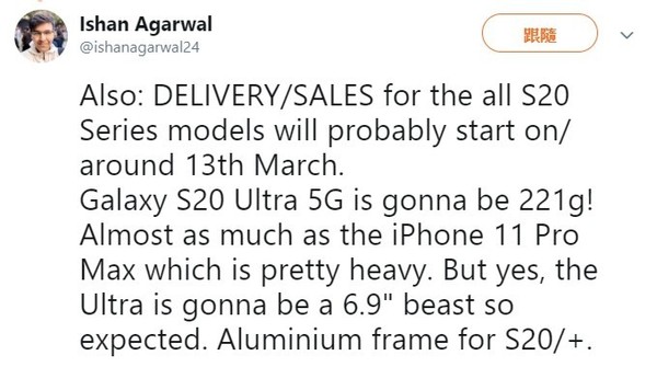据国外知名爆料达人Ishan Agarwal最新爆料的消息显示,全新的三星Galaxy S20系列新机将有望于3月13日左右在海外市场正式开售。除此之外,Ishan Agarwal还表示,6.9英寸屏的Galaxy S20 Ultra 5G的重量为221克,几乎和iPhone 11 Pro Max一样重。S20和S20+将采用铝制框架。