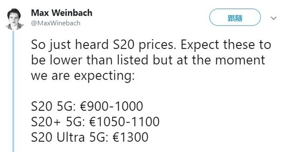 至于该机的售价,另一位爆料达人Max Weinbach近日也带来了最新的消息,据他了解到的信息来看,Galaxy S20 5G的价格预期会在900欧元到1000欧元之间(约合人民币6878元-7642元人民币);Galaxy S20+ 5G的价格预期会为1050欧元到1100欧元之间(约合人民币8024元-8400元人民币);而Galaxy S20 Ultra 5G的价格则有望达到1300欧元(约合人民币9935元人民币)。