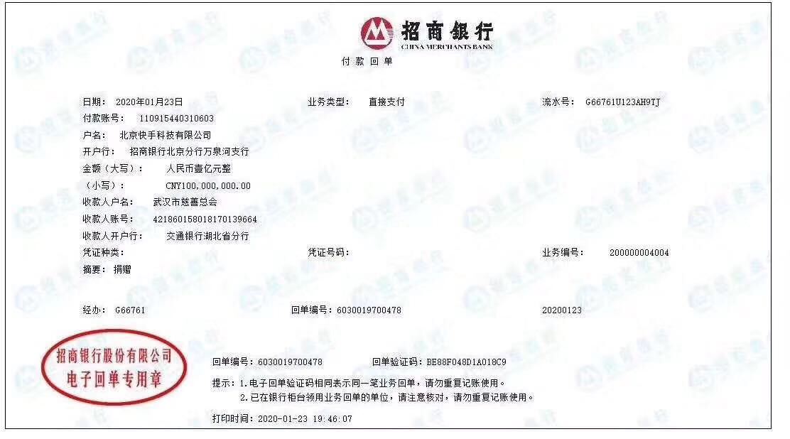 23日,武汉市新冠肺炎防控指挥部收到北京快手科技有限公司捐赠的1亿元人民币。自从疫情发生以来,社会各界非常关心和支持,体现了社会大爱和守望相助的精神。23日,19时,武汉市慈善总会收到了1亿元的捐赠款,据了解武汉市慈善总会是武汉市新冠肺炎防控指挥部指定的接受捐赠的两个账户之一,此笔捐款是来自北京快手科技有限公司。