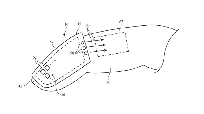 苹果表示,在虚拟现实系统中,可以使用力反馈手套来控制虚拟对象。诸如此类的设备可能对用户来说不方便,笨重或不舒服,或者提供的反馈不足。苹果建议使用纤细的传感器,可以戴在手指上,而不是笨拙的大手套或只能提供最小反馈的触觉反馈显示屏。苹果表示,触摸传感器可以安装在手指设备的外壳中,在对象沿着外壳的外表面移动时收集来自外部对象的输入。
