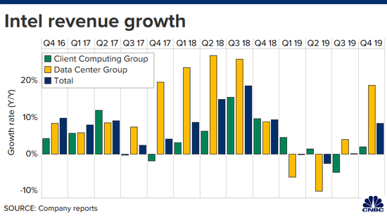 英特尔今天公布了2019财年第四季度及全年财报。报告显示,英特尔第四季度营收为202.09亿美元,与上年同期的186.57亿美元相比增长8%;净利润为69.05亿美元,与上年同期的51.95亿美元相比增长33%。英特尔第四季度营收和调整后每股收益均超出华尔街分析师预期,且2020财年第一季度和全年业绩展望也均超出预期,推动其盘后股价大涨近7%。
