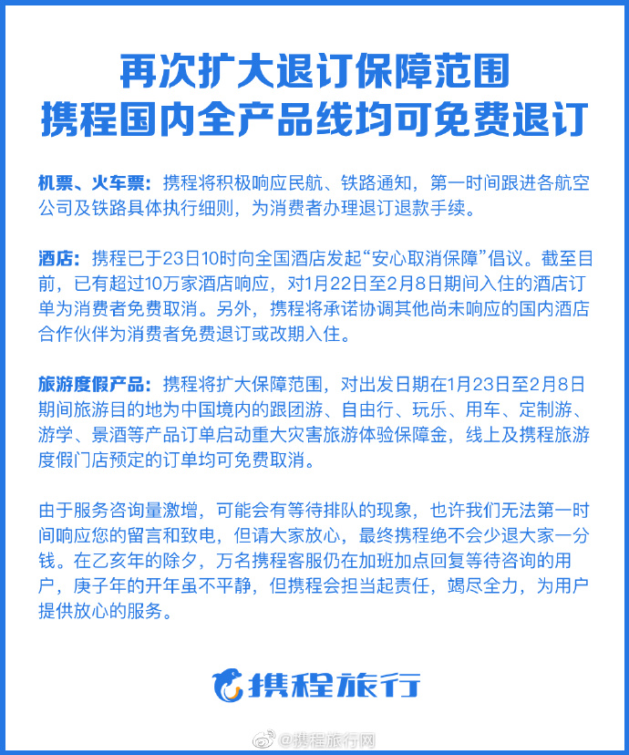 1月24日消息,携程宣布将积极响应民航、铁路通知,第一时间跟进各航空公司及铁路具体执行细则,为消费者办理退订退款手续。在酒店方面,携程已于1月23日10时向全国酒店发起“安心取消保障”倡议。