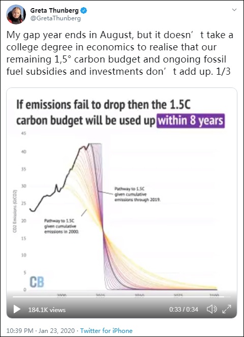 很快,通贝里在社交媒体上作出回应。她说,自己的高中毕业旅行期将于8月结束,但“不需要经济学学位”也能意识到,对化石能源的持续投入与温室气体排放总量的上限不成比例。