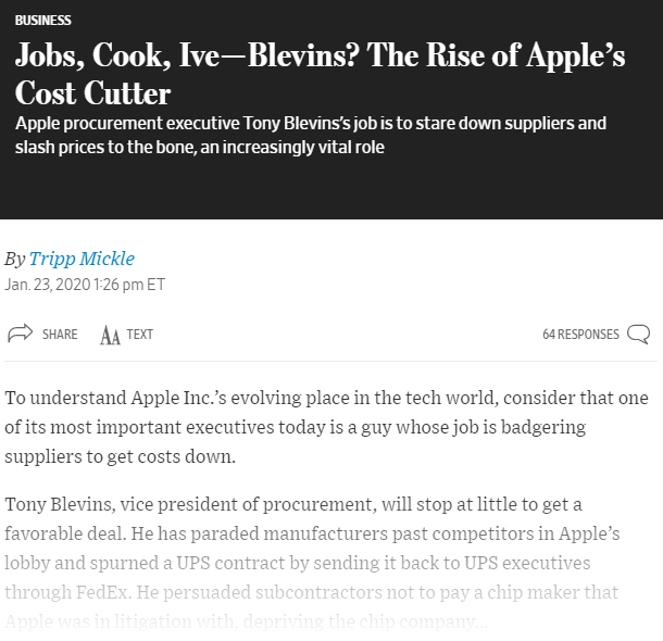 《华尔街日报》近日发表了介绍苹果公司采购副总裁 Tony Blevins 的专题文章,让我们对这家科技巨头的企业文化和这位高管的成就有了更加深入的了解。据悉,作为苹果公司的采购副总裁,Blevins 的主要工作,就是努力降低供应链体系中的价格成本。比如在与芯片制造商高通产生专利费纠纷的持久战期间,Blevins 就发挥了主要的推动作用。