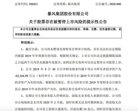1月24日消息,暴风集团发布公告称,截至目前,公司尚未聘请首席财务官和审计机构,存在无法在法定期限内披露2019 年年度报告的风险。根据相关规定,上市公司在法定披露期限届满 之日起两个月内仍未披露年度报告,深圳证券交易所可以决定暂停公司股票上市。