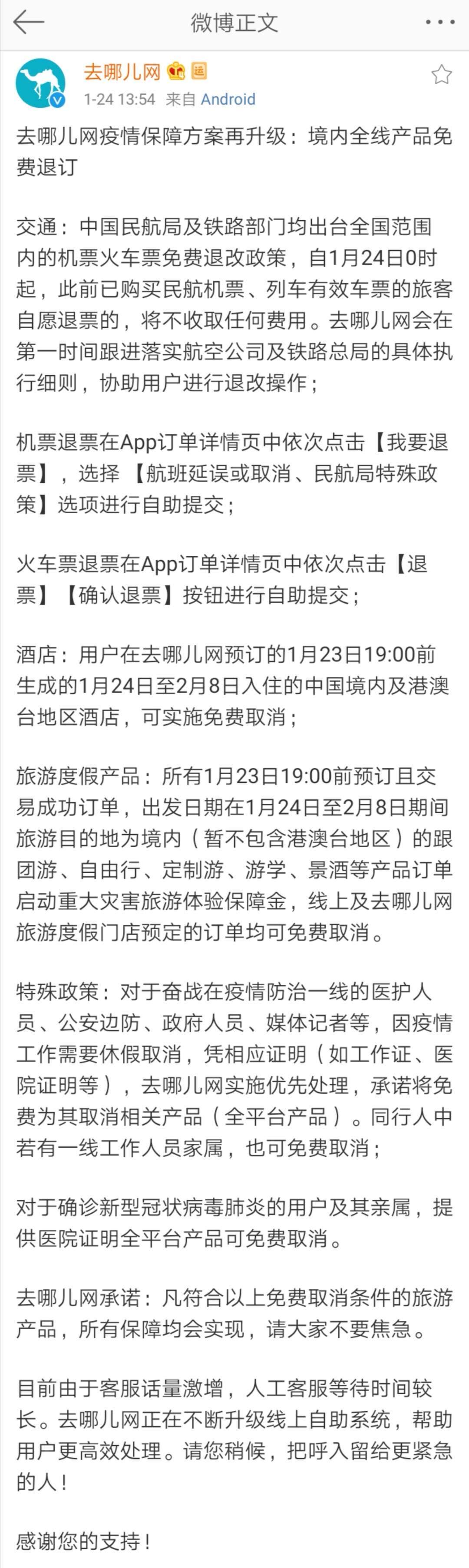 旅游度假产品:所有1月23日19:00前预订且交易成功订单,出发日期在1月24日至2月8日期间旅游目的地为境内(暂不包含港澳台地区)的跟团游、自由行、定制游、游学、景酒等产品订单启动重大灾害旅游体验保障金,线上及去哪儿网旅游度假门店预定的订单均可免费取消。