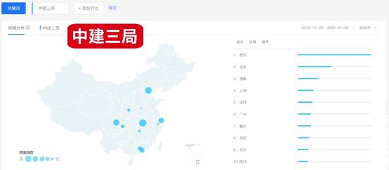 在这两个搜索词的地域分布中,武汉均位列第一。尤其中建三局,武汉搜索该词的量级几乎达到第二名北京市的两倍。