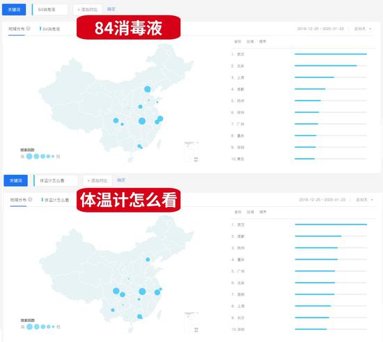 百度指数显示,“84消毒液”的搜索指数一路上升,在搜索地域分布上,武汉是搜索最多的城市。另外,由于发热是此次新型冠状病毒肺炎的重要特征,在“体温计怎么用”、“体温计怎么看”、“体温计要量多久”等搜索词的地域分布上,武汉均排名第一。这些指数均在23号迎来最高峰,反映出“封城”情况下,大量武汉市民积极响应号召,自我防护,遏制疫情扩散。