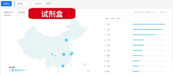 搜索大数据证明了这一现象。百度指数显示,武汉市民除了对n95口罩极其关注外,对“试剂盒”也极为在意。从试剂盒的搜索指数趋势图可以看出,搜索指数在1月23日达到一个高峰,并且有进一步加大的趋势。媒体报道称,不少患者都对试剂盒的供应问题表示担忧。