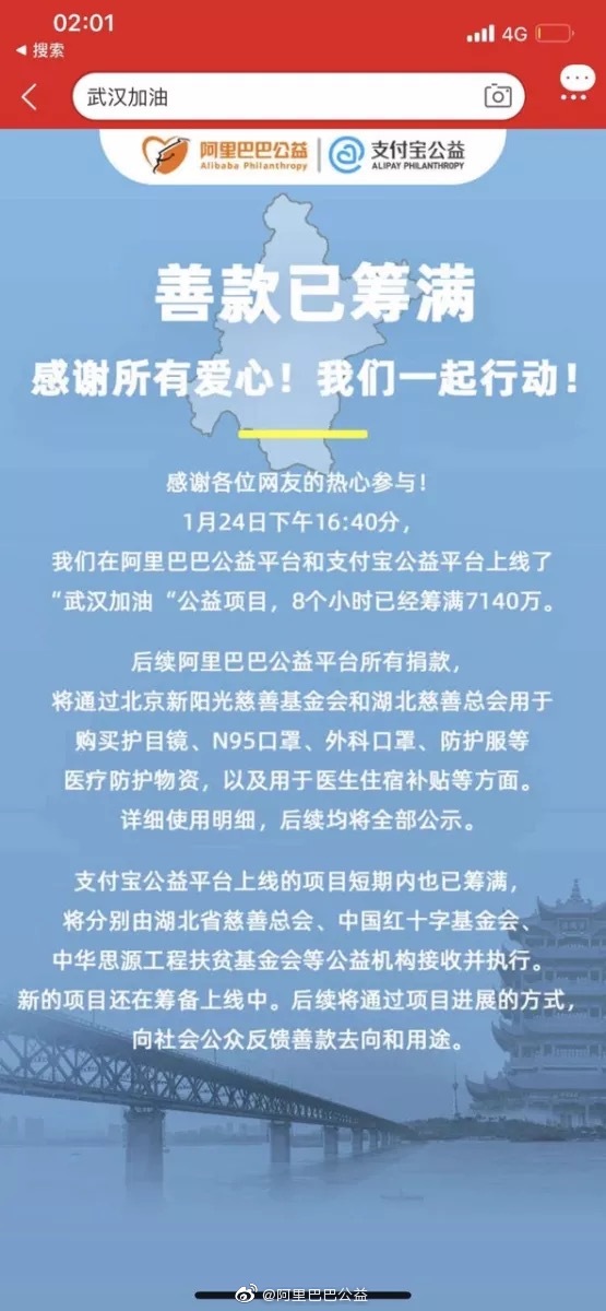 阿里巴巴宣布,1月24日下午16:40分,在阿里巴巴公益平台和支付宝公益平台上线的“武汉加油“公益项目,8个小时已经筹满7140万。后续阿里巴巴公益平台所有捐款,将通过北京新阳光慈善基金会和湖北慈善总会用于购买护目镜、N95口罩、外科口罩、防护服等医疗防护物资,以及用于医生住宿补贴等方面。详细使用明细,后续均将全部公示。