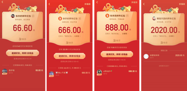 快手宣布春晚红包互动总量达639亿次,红包站外分享次数达到5.9亿次,快手春晚直播间累计观看人次7.8亿,最高同时在线人数2524万。除夕之夜,快手作为中央广播电视总台《春节联欢晚会》独家互动合作伙伴,首创5轮红包互动,向全球观众发出10亿元现金红包。当晚有221万人抢到金额从66.6元到2020元不等的“锦鲤红包”。