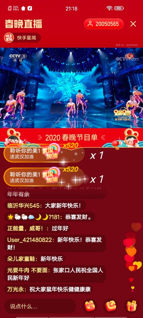 春晚直播期间,快手还上线 “武汉加油”专属定制公益礼物,该礼物所得的全部收入,快手将捐赠给武汉慈善总会;快手于初一红包提现开启时上线“公益支持武汉”功能,用户可以自主选择是否将自己的春晚红包捐赠,若捐赠,快手会在此基础上额外捐赠10%,共同助力武汉抗击新型肺炎疫情。